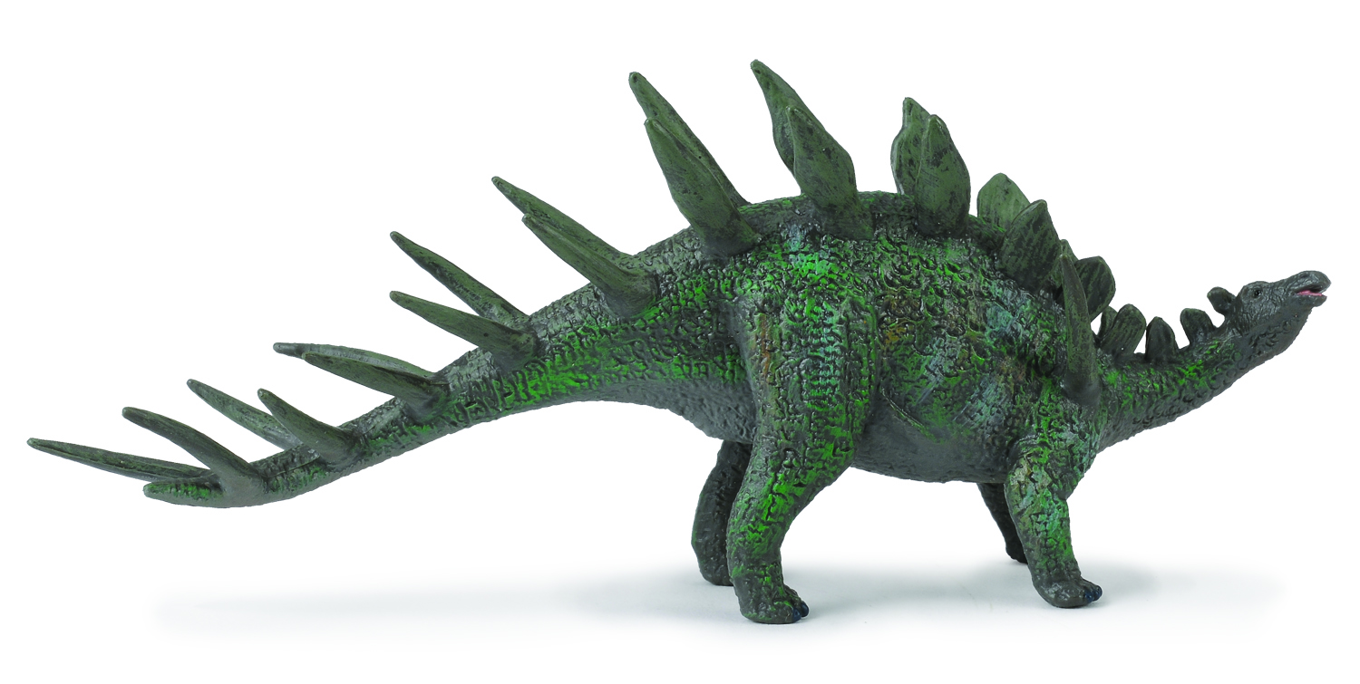 Ein mittelgroßer Stegosaurus mit einer doppelten Reihe klingenartiger Platten, die über seinen Rücken verlaufen, und einem Schwanz, der über die gesamte Länge mit paarweisen Stacheln gekrönt ist.